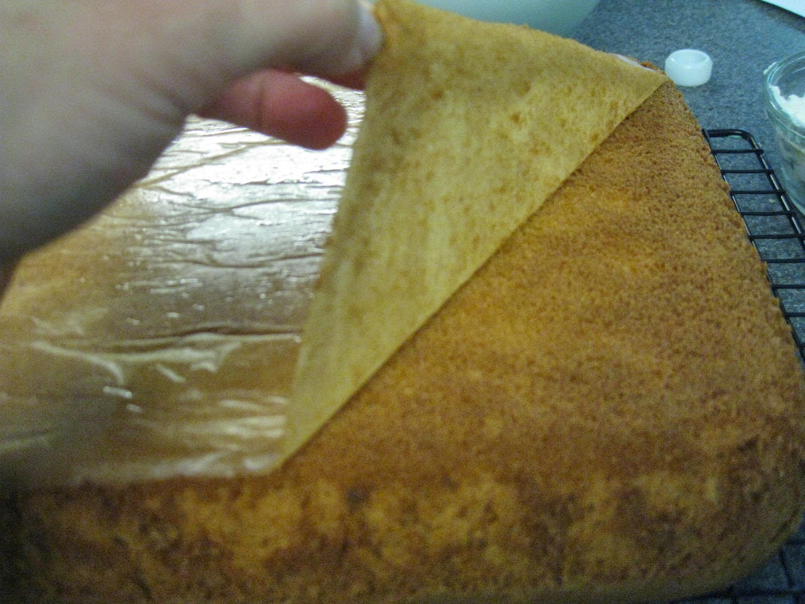 Then remove the frosting transfer from the freezer. Carefully remove the tape and take the frosting transfer (still on the waxed paper) off the sheet. Turn it over onto the cake in the location you want it, and carefully remove the waxed paper.